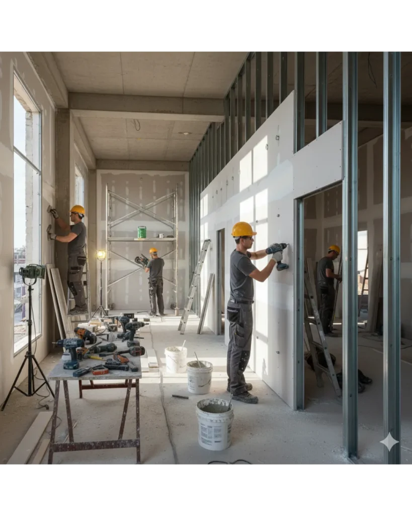Pemasangan partisi gypsum, kaca, panel, dan dinding interior dengan standar kualitas tinggi.
